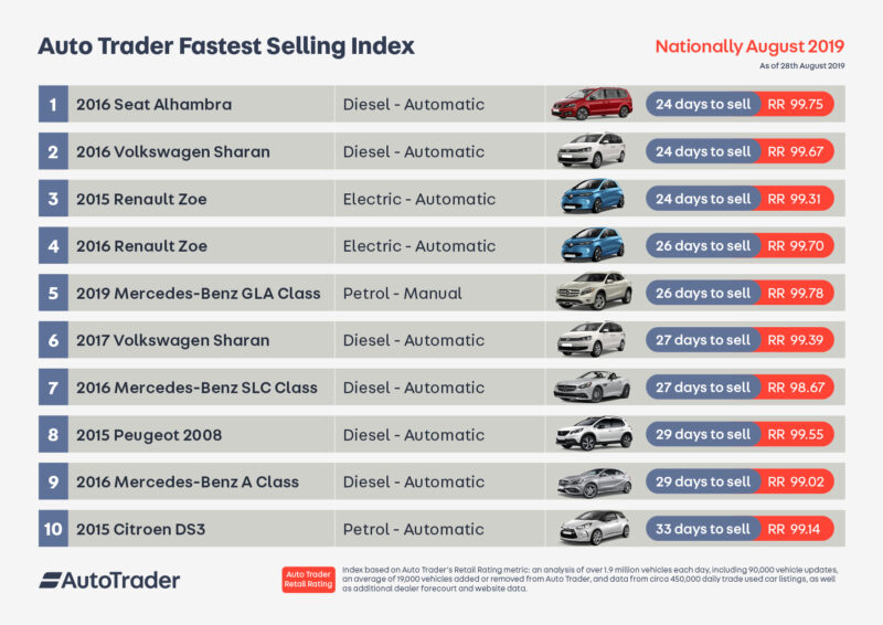 All three feature at the top of the first Auto Trader Fastest-Selling Index published this week. This shows that, if priced to the live retail market, the public has a strong appetite for the bigger people carriers with the MPVs and a 2015 Zoe taking an average of just 24 days.