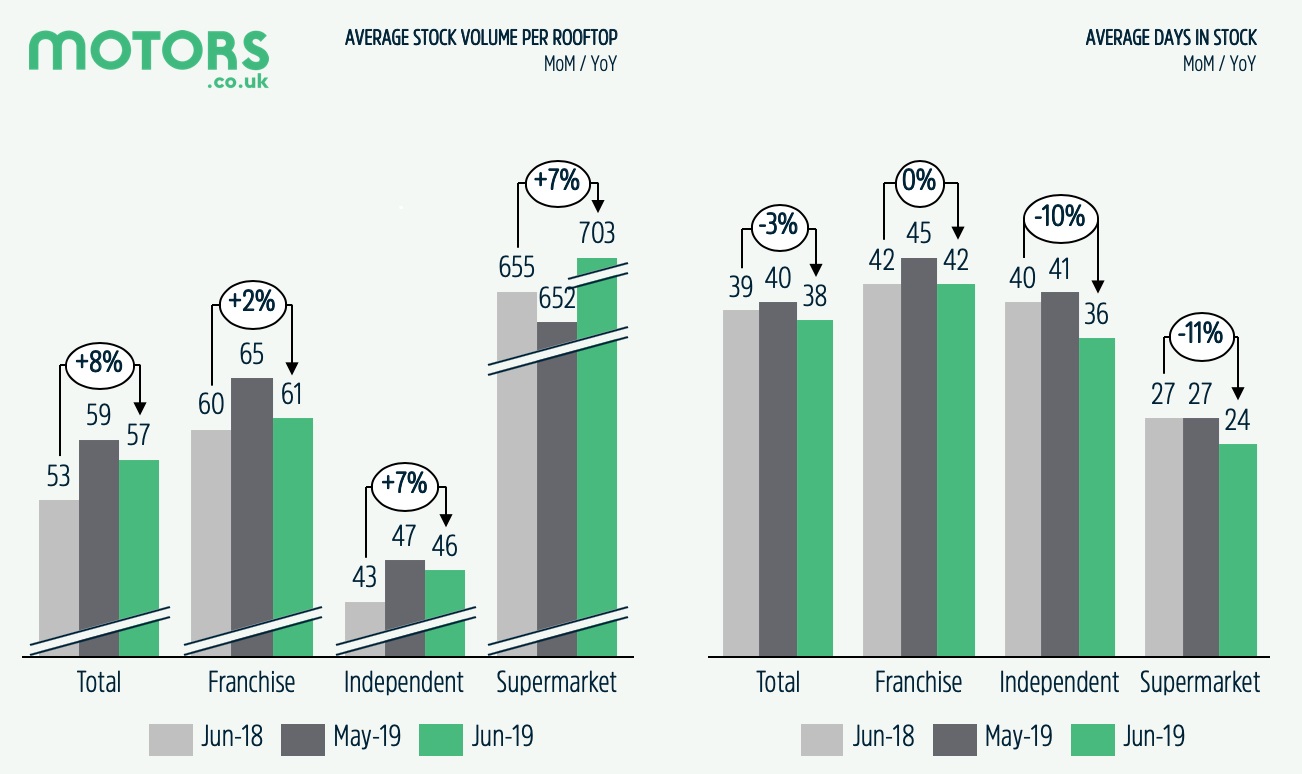 Stock levels rose by 7% from 43 to 46 units but dealers enjoyed both year-on-year and month-on-month improvements. Vehicles averaged 36 days in stock in the month of June 2019, compared with 40 days last year and 41 days in May 2019.